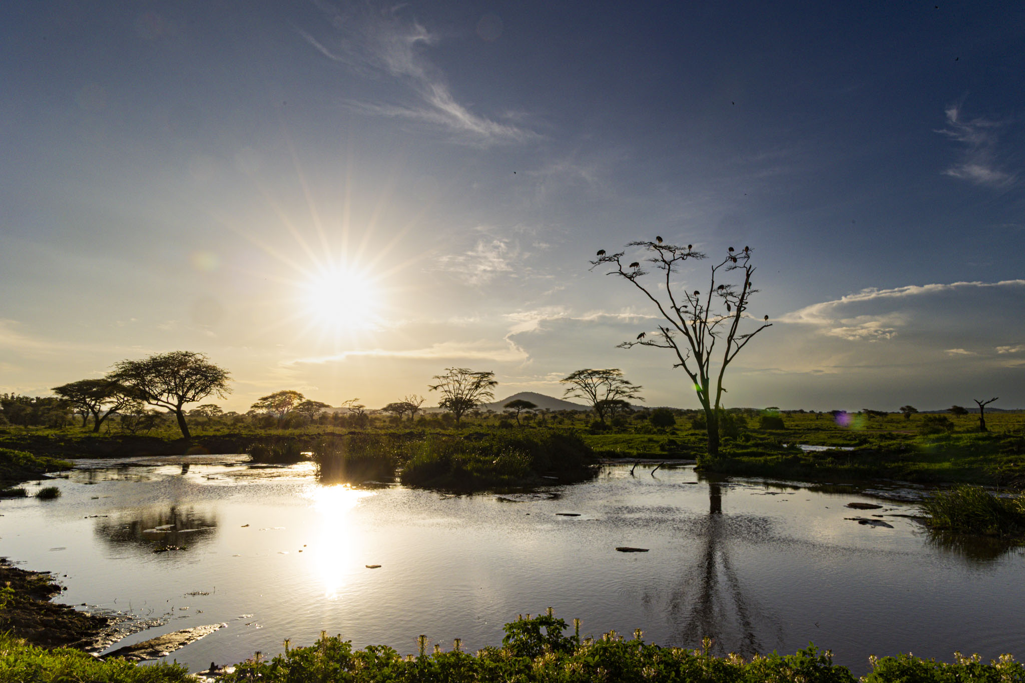 Along the river hundreds of hippo packed the water so tightly it looked solid. Low grunts, bellows, splashes — another ecosystem layered on the plains. After dark their calls rolled through camp, meeting distant hyena laughter and the heavy silence between. Central Serengeti wasn’t about single moments; it was volume — of life, of sound, of memory. Everything alive at once.